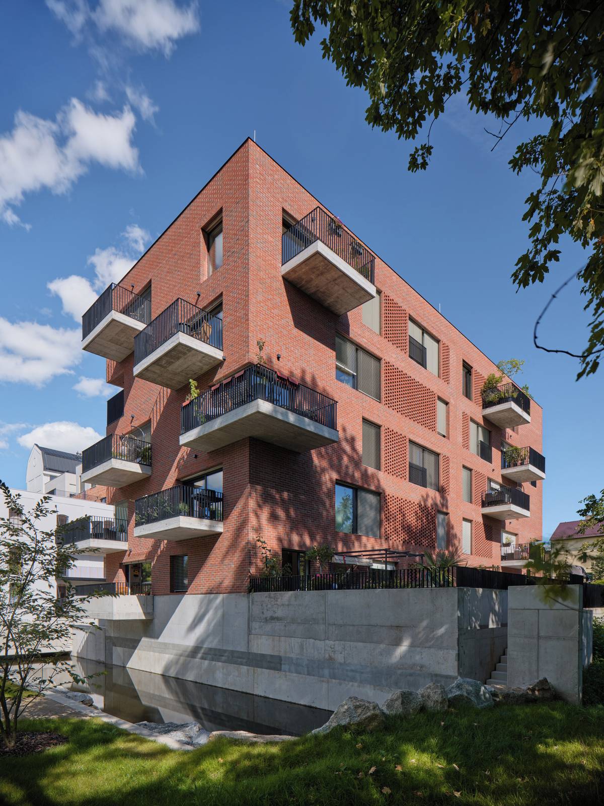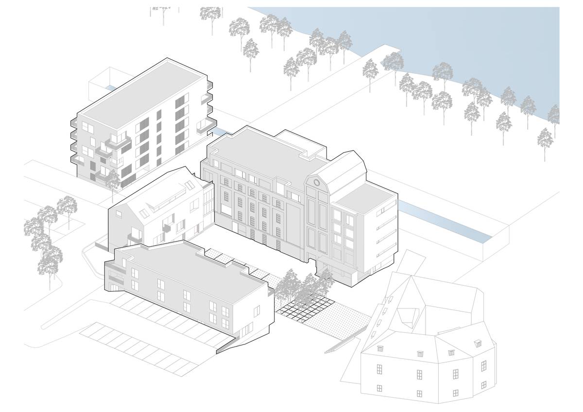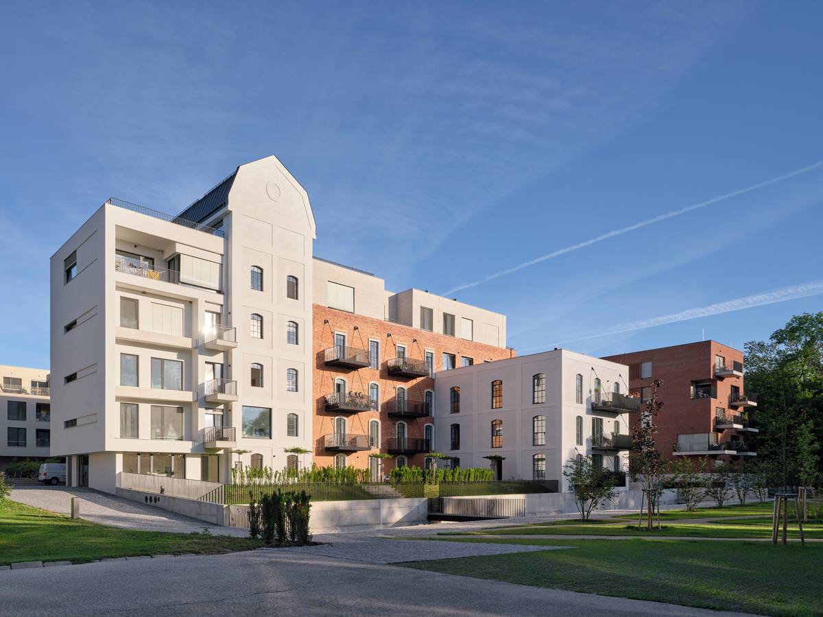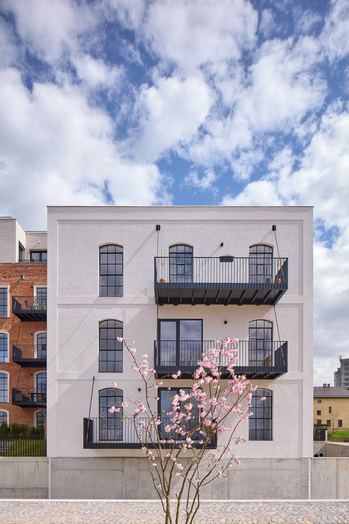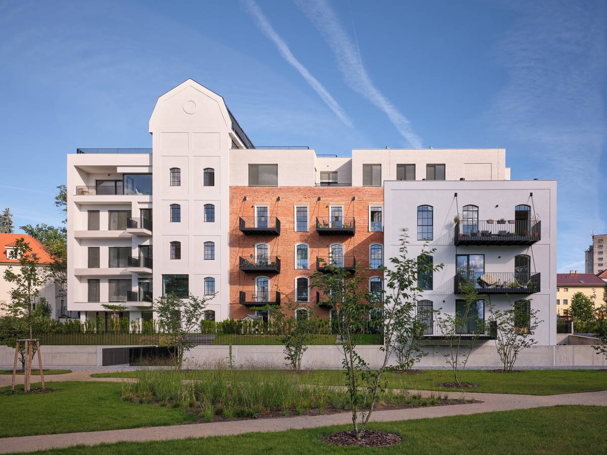 Žitný mlýn Boršov dnes. Druhá novostavba má na fasádách stejné světlé cihelné pásky jako nástavba historické budovy sila.