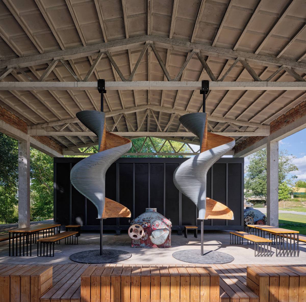 Žitný mlýn Boršov dnes. Zachovná konstrukce bývalé garáže slouží jako odpočinkový galerijní prostor.