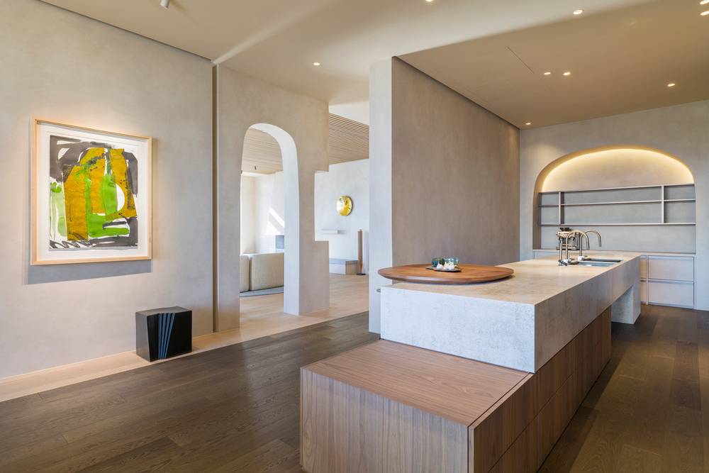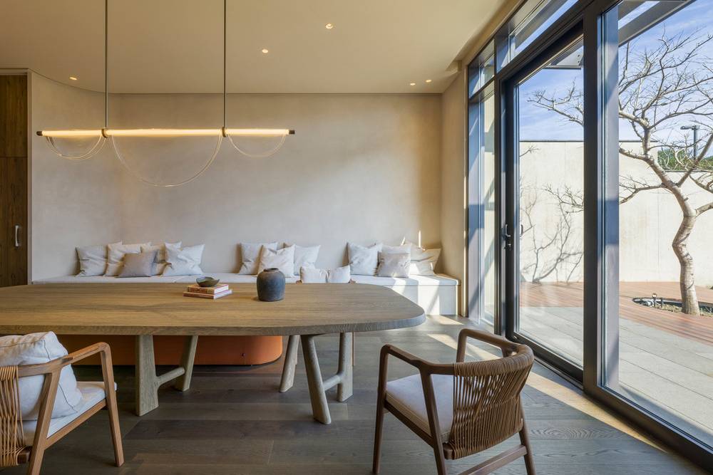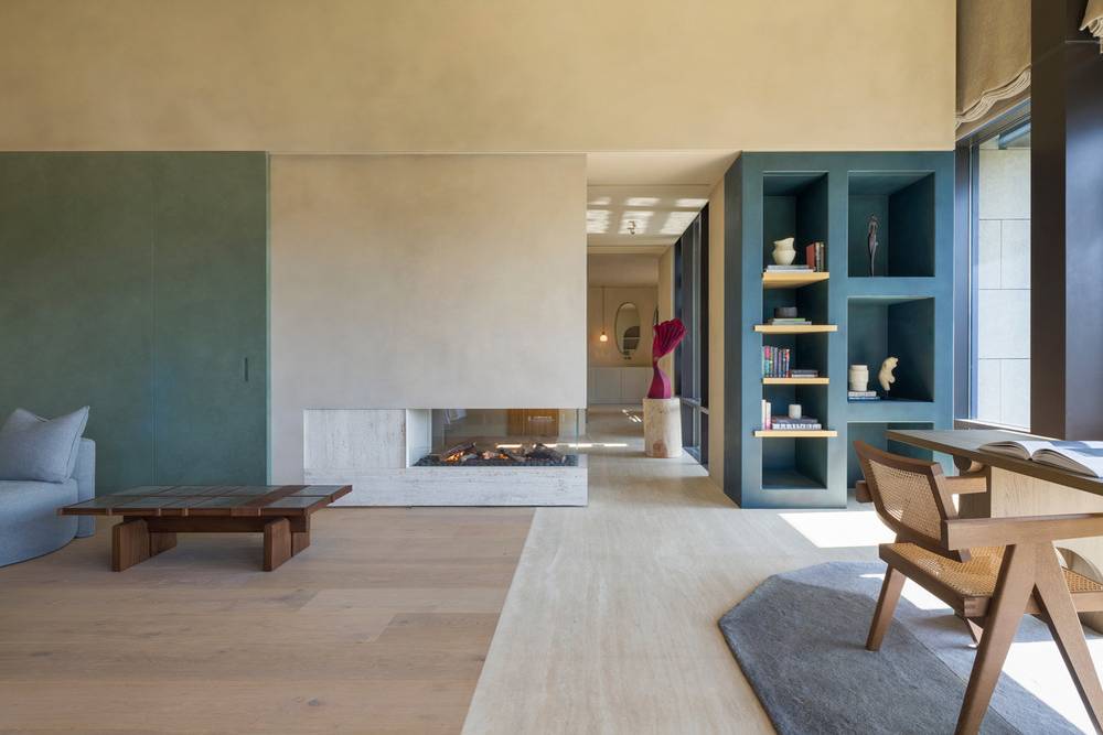 Interiér vily jako by rozmlouval s okolní krajinou. Všimněte si, jak nařasení textilie imituje mraky.