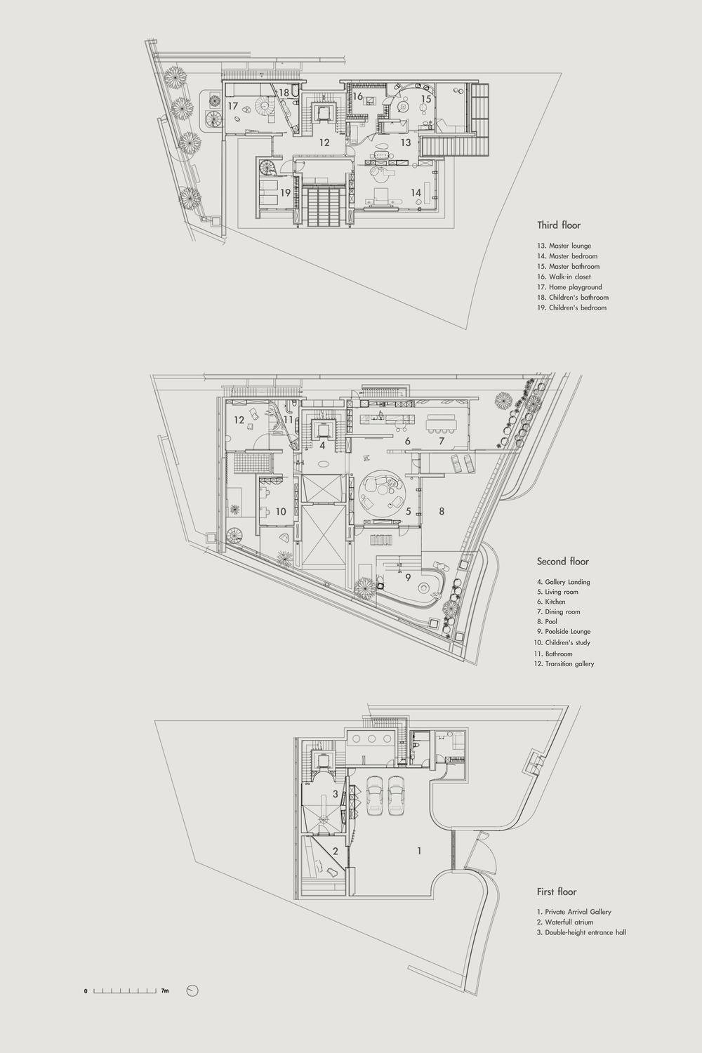 Půdorys všech tří podlaží vily. Na nákresu jsou nad sebou přesně tak, jak to odpovídá jejich uspořádání ve skutečnosti.