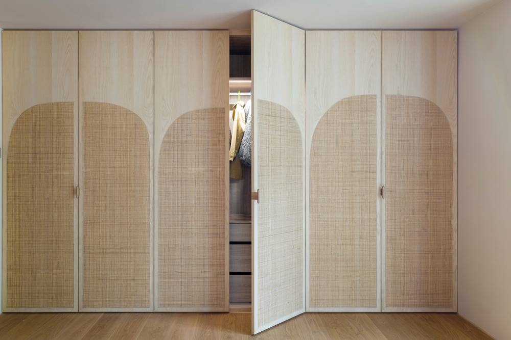 Pravoúhlé a zaoblené tvary se nápaditě potkávají i na vestavěných skříních.
