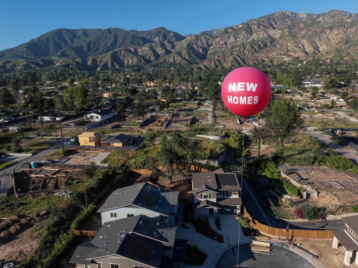„Vidět, jak se příroda po požárech vrací, je tak povzbuzující,“ řekla Roxanne Albeeová, když opouštěla restauraci. (Reklamní balón nad novostavbou, 19. března v Altadeně.)