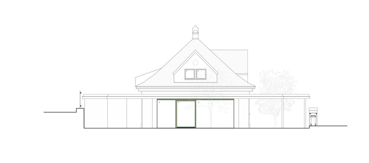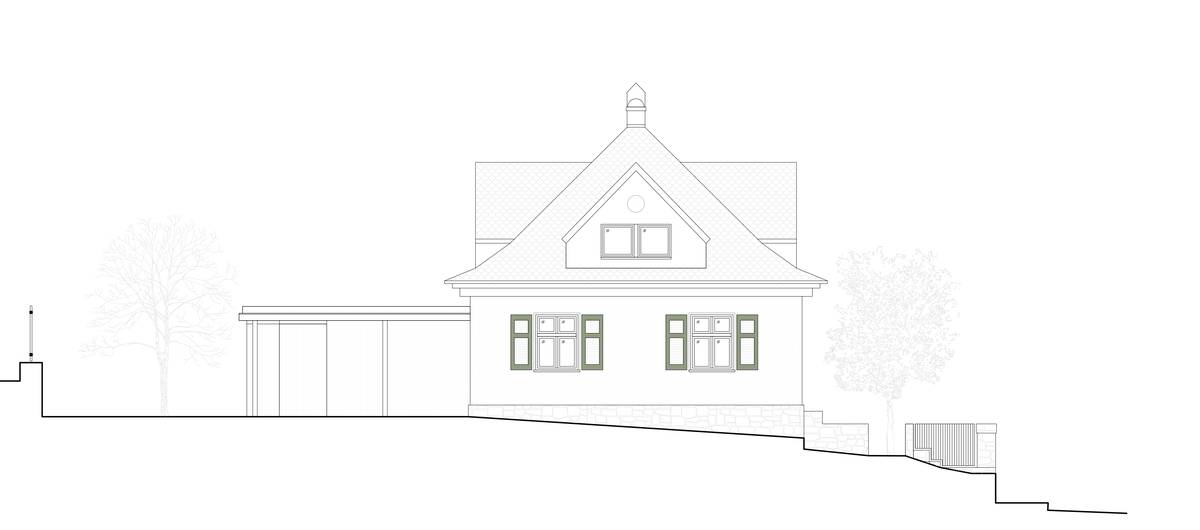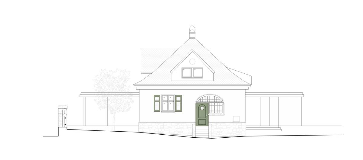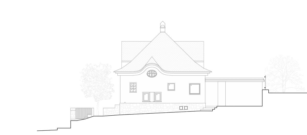 Garáž byla odstraněna. V původní podobě byl dům bez ní.