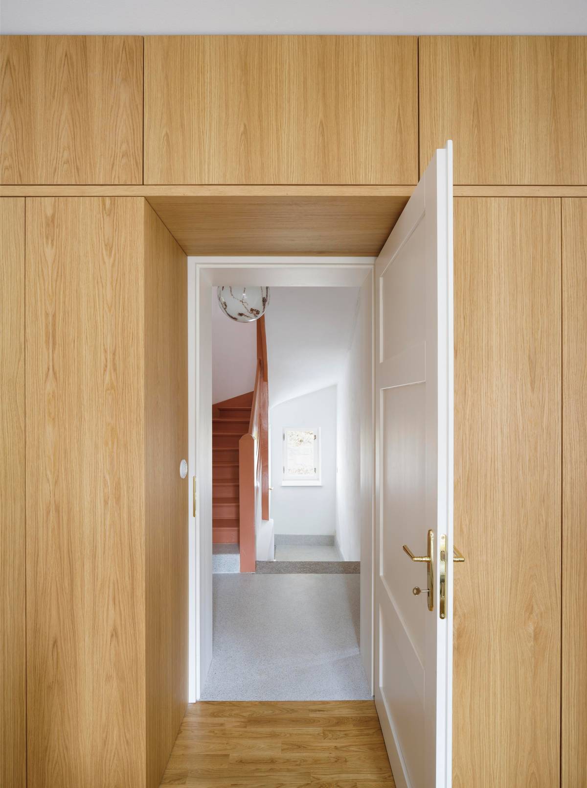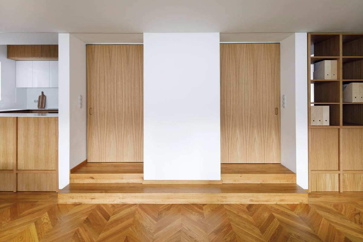 Pohled z obývacího pokoje vytvořeného v přístavbě. Levé dveře vedou do kuchyně a za ní dál do chodby, pravé do pracovny a za ní dál do ložnice.