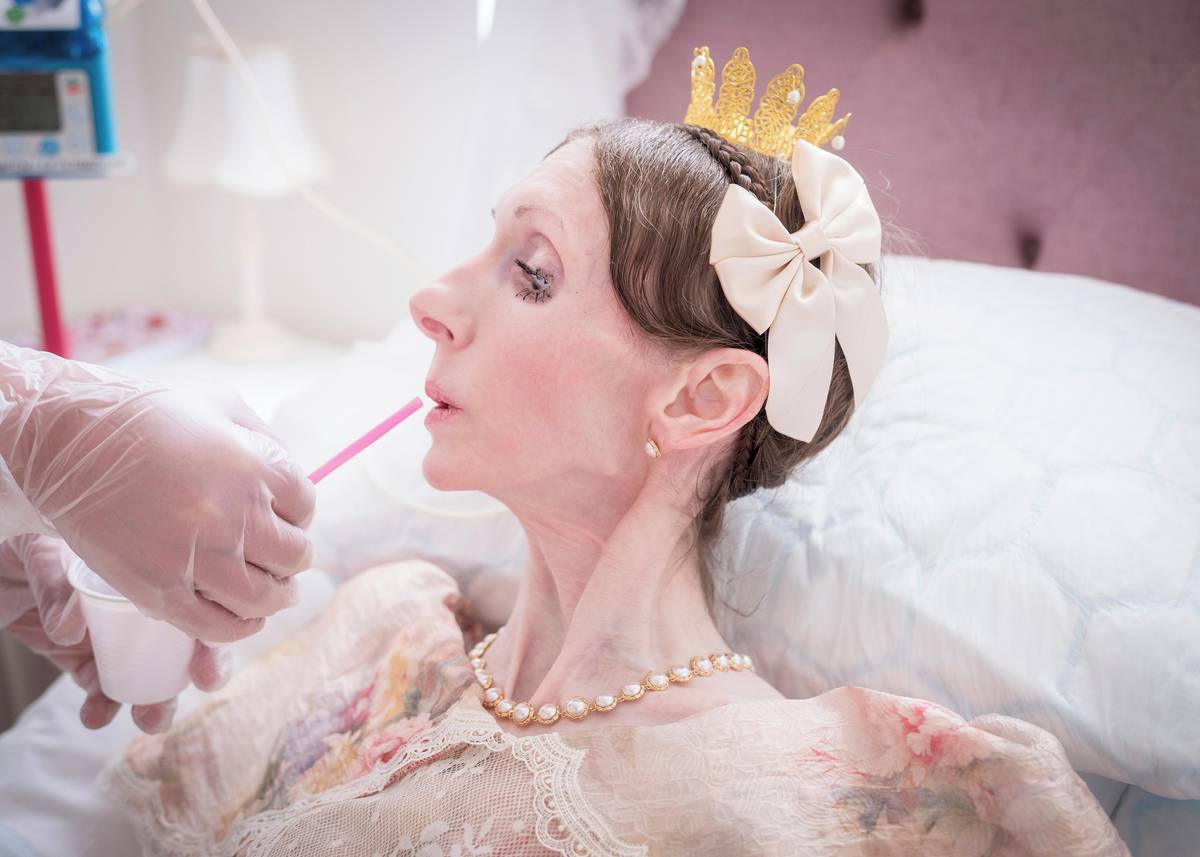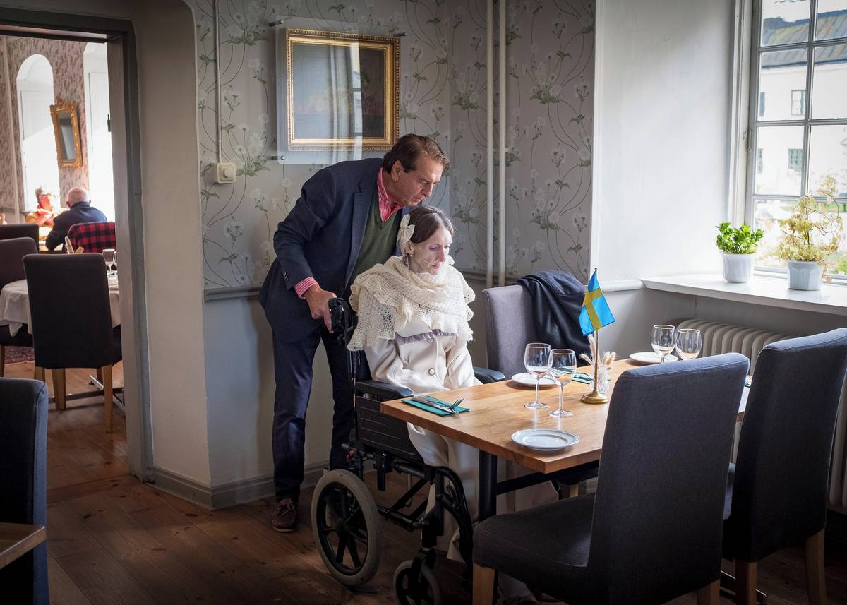 (Asistentka pomáhá bývalé tanečnici Engle Louise pít brčkem. Dříve ji denně navštěvovaly zdravotní sestry, nyní je její péče zajištěna na základě zvláštní dohody mezi zdravotníky a městem. Vyfoceno 2. května v Linköpingu.)