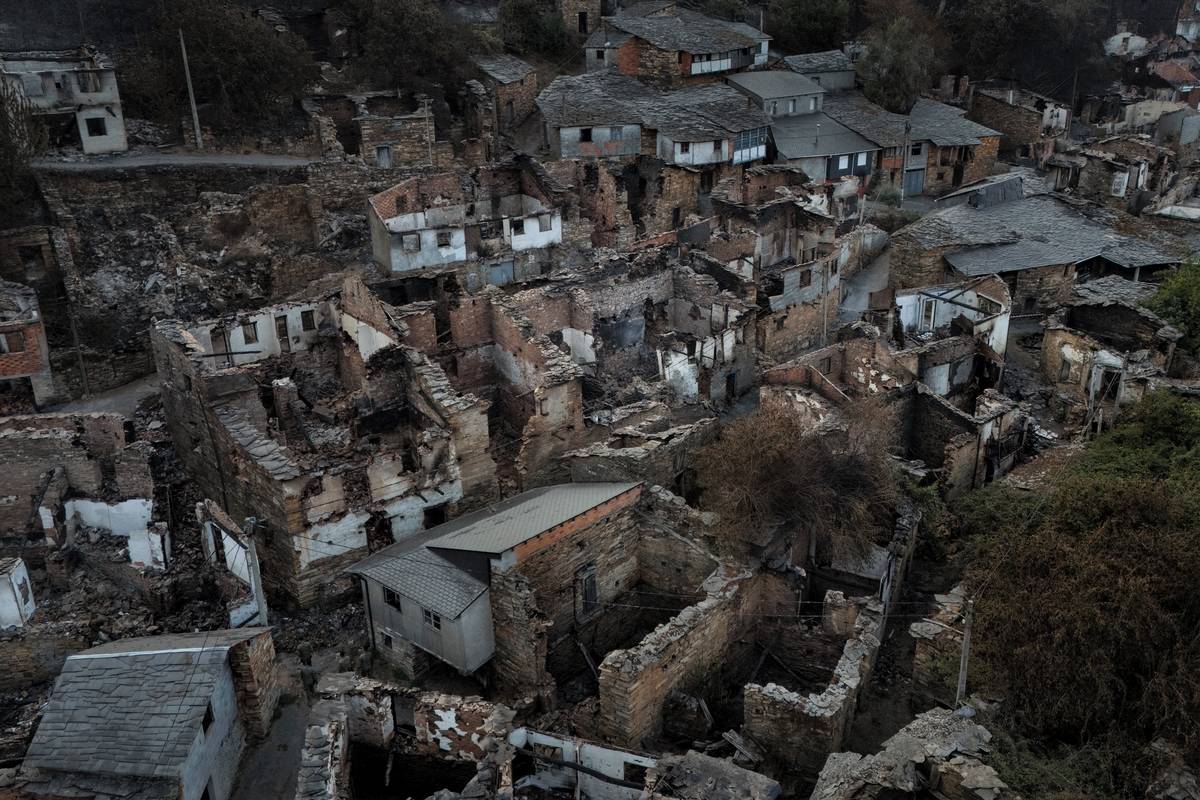 (Letecký pohled na San Vicente de Leira, jednu vesnic poškozenou požáry, vyfoceno 21. srpna 2025 v Galicii.)