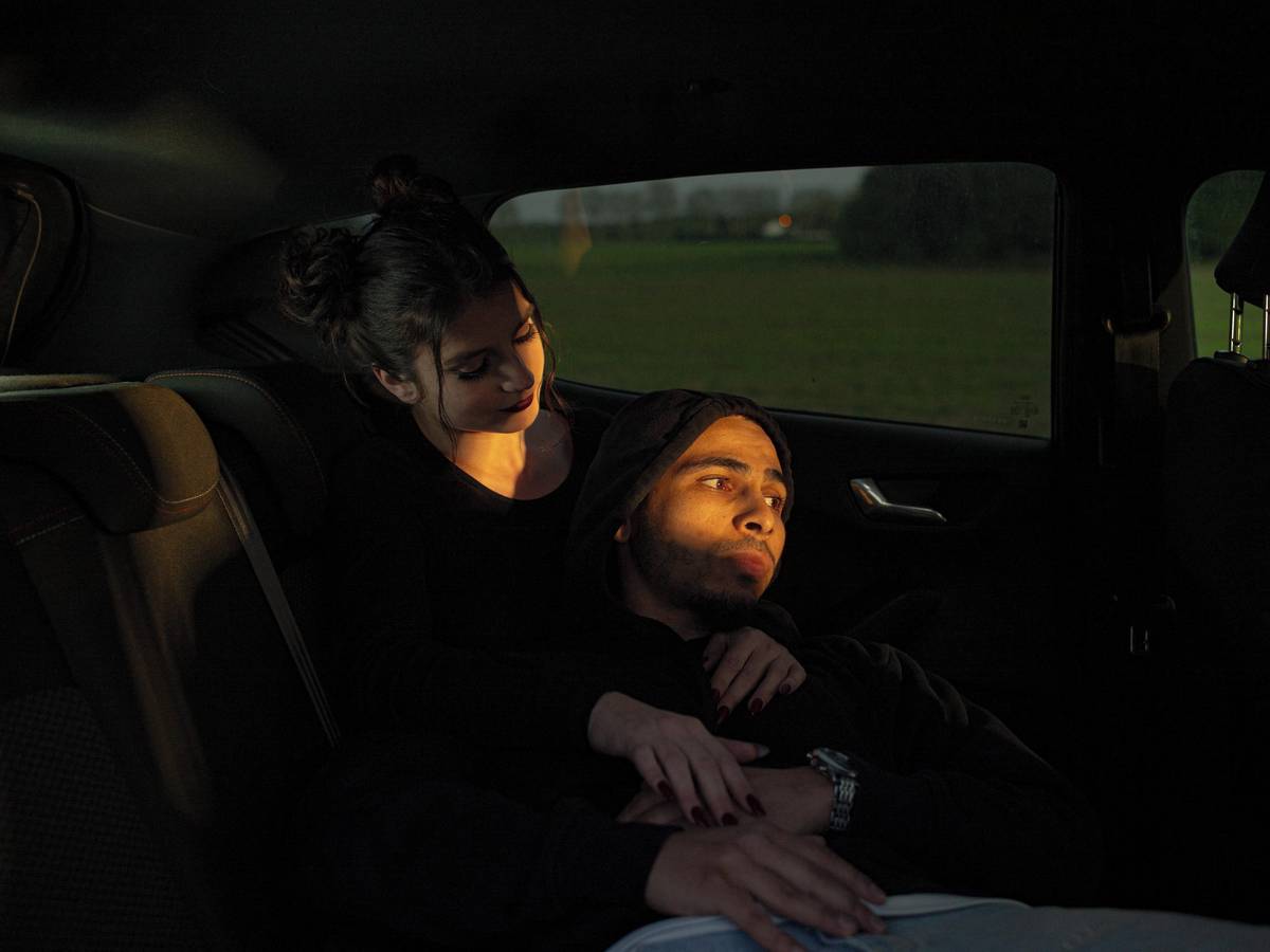 (Younes a Sandra se objímají v autě, 18. dubna 2024 v Seine-Saint-Denis, Francie.)
