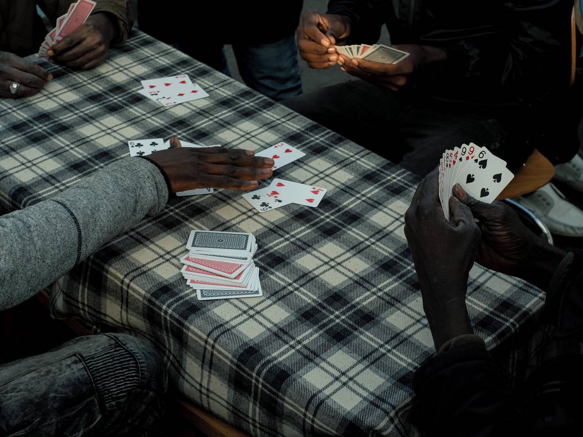 Súdánští migranti hrají karty v táboře Ecluse naproti Stade de France. 12. listopadu 2020 v Saint-Denis.
