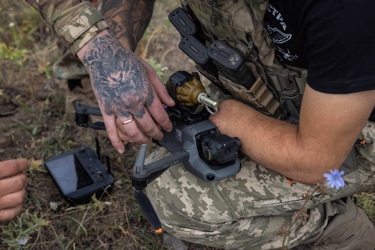 (Ukrajinský voják drží svou částečně amputovanou rukou dron, na který se právě montuje granát. V roce 2022 muž utrpěl zranění a nyní cvičí rekruty v ovládání dronů. Vyfoceno v Doněcké oblasti, 5. srpna 2024.)