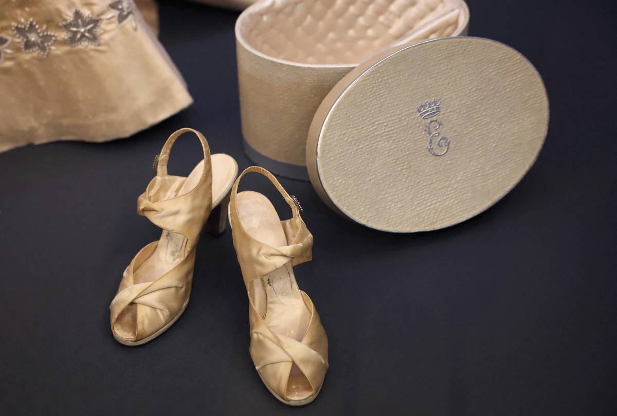 Sandály na vysokém podpatku z hedvábného saténu byly součástí svatebního outfitu z roku 1947.