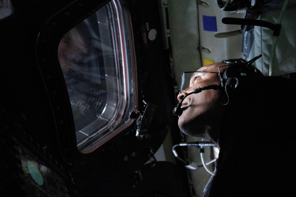 „Běhal mi z toho mráz po zádech a potily se mi ruce,“ popsal Wiseman zážitky z průletu kolem Měsíce či pohledu na rodnou planetu mizející za jeho odvrácenou stranou. (Victor Glover během přeletu kolem Měsíce, 6. dubna.)