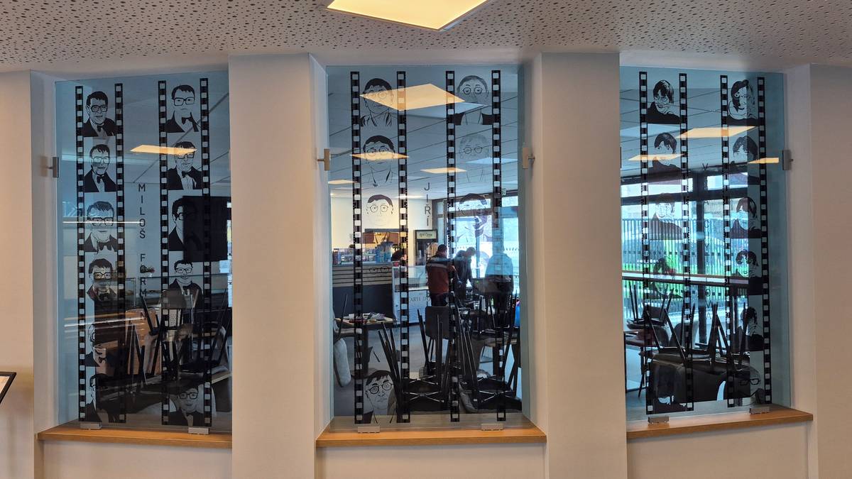 Originální zdobení oken mezi foyer kina