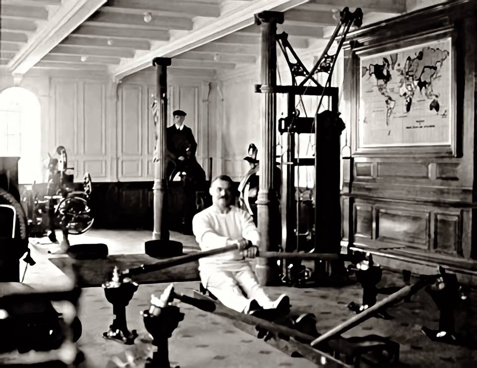 Na Titanicu byla cestujícím k dispozici tělocvična. Vepředu si lze všimnout veslovacího trenažéru.