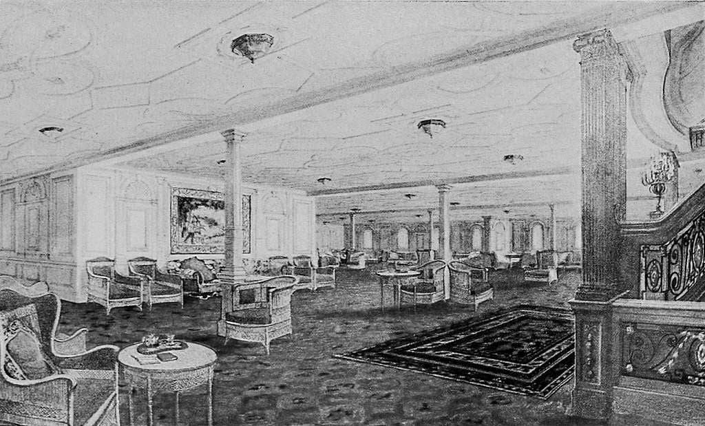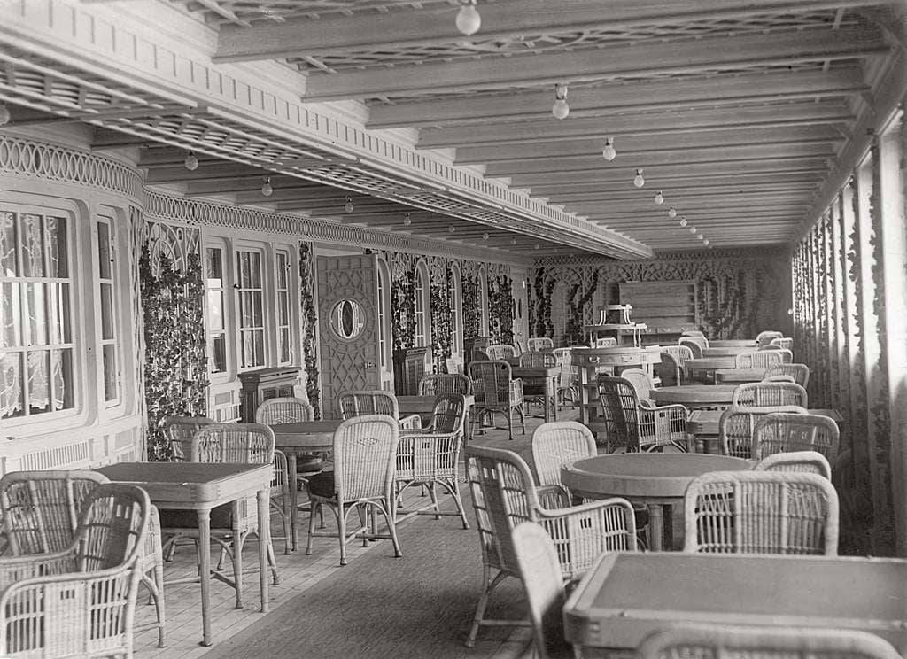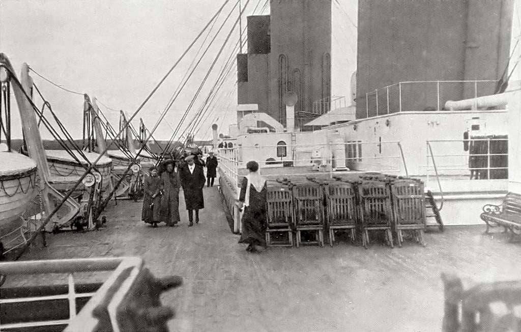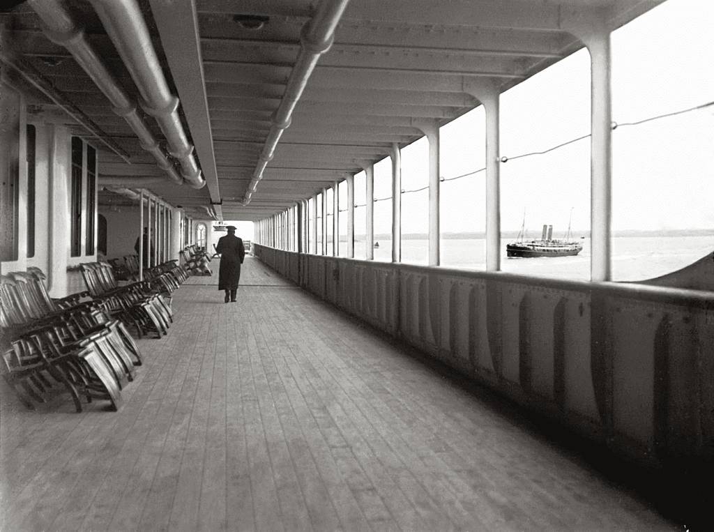 Snímek pořízený z pravoboku zachycuje promenádu pro pasažéry 2. třídy.