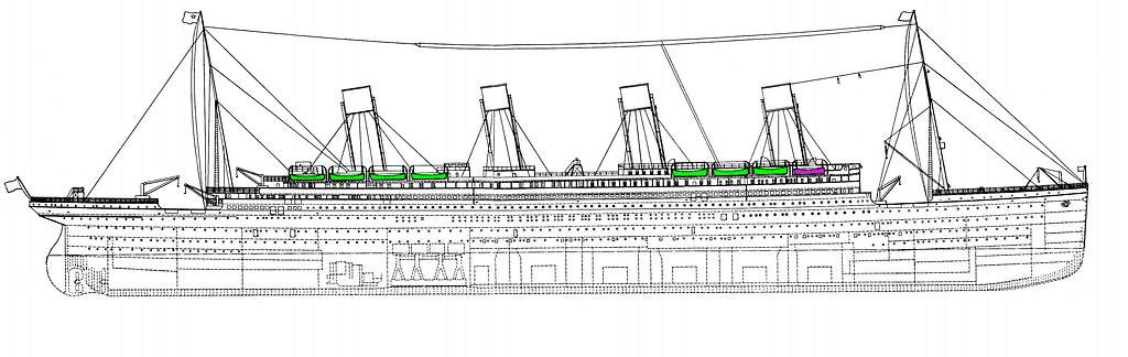 Boční plán lodi zobrazující umístění záchranných člunů.