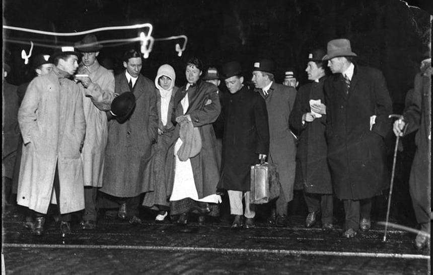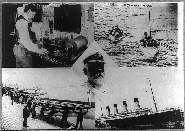 Kompozice 5 fotografií. Uprostřed je vyobrazen kapitán Smith, nalevo nahoře radista přijímající tísňové volání. Kromě toho jsou tu záchranné čluny přepravující přeživší.