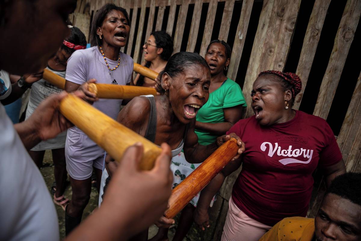 Komunitu, kterou tvoří potomci afrických otroků přivezených v 18. století, ohrožuje nelegální těžba, kácení lesů a ozbrojené konflikty. (Lidé nesou vyčerpaného Manacilla. Tradice velí, že Manacillos nesmějí během prvních 48 hodin rituálu spát. Ti, kteří usnou, jsou rituálně bičováni. 19. dubna 2025.)