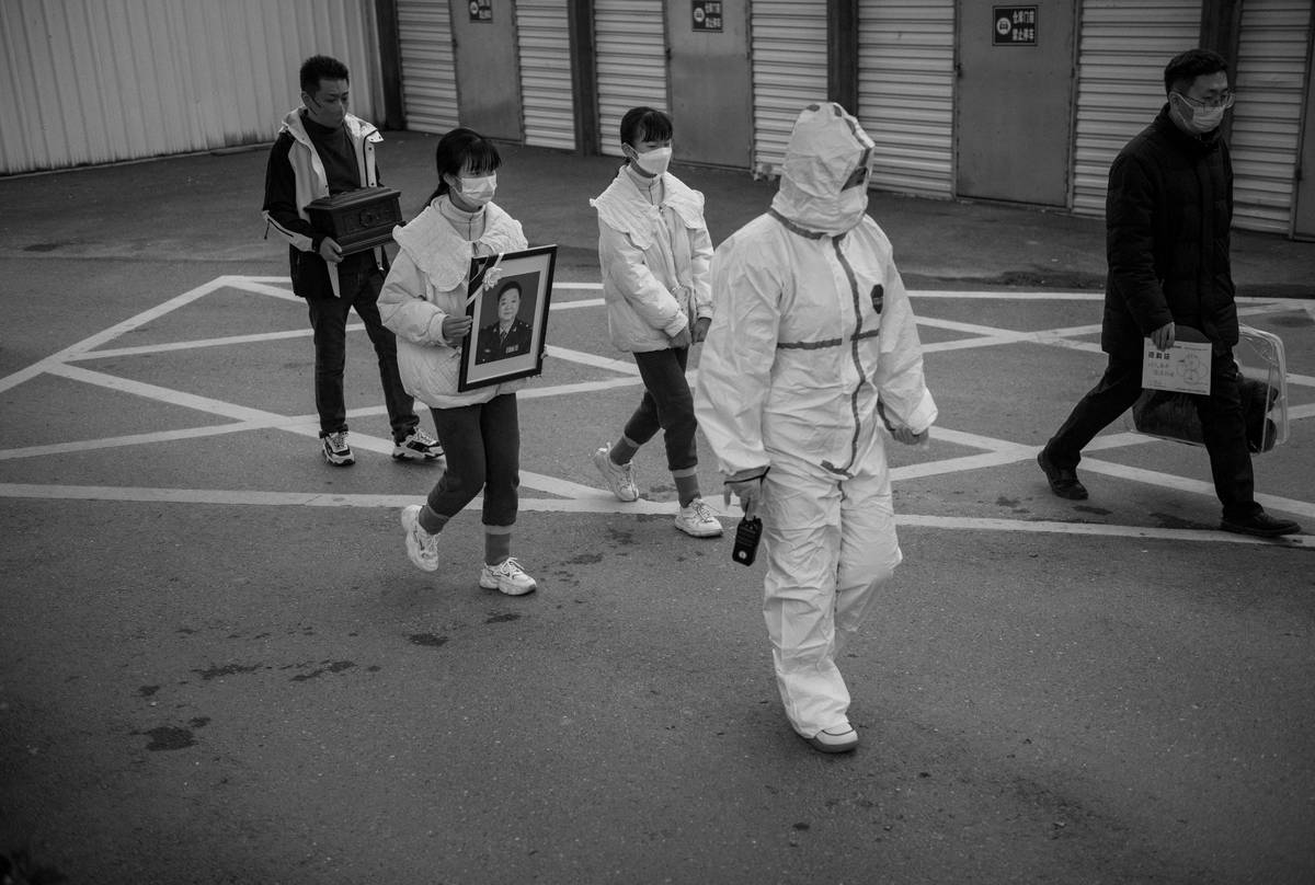 Č'-č' a Chuej-chuej nesou portrét otce během pohřebního průvodu. Wu Ťing-čou zemřel koncem roku 2022 a zanechal 72letou Šeng Chaj-lin, aby sama vychovávala jejich dospívající dcery. (8. prosince 2022)