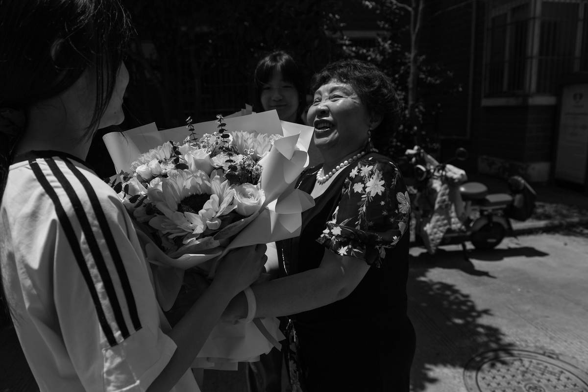 Šeng Chaj-lin předává dcerám květiny po absolvování přijímacích zkoušek na střední školu. I ve svých 75 letech žena nadále dokumentuje svůj život online, aby zajistila budoucnost rodiny. (16. června 2025)