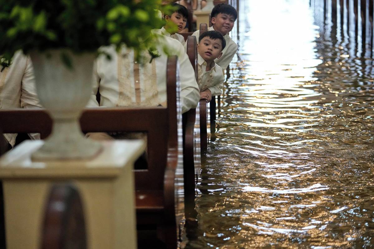 Pár se rozhodl pokračovat i přes vysokou hladinu vody ve svatostánku. (Svědci a hosté v barong tagalog, filipínském národním oděvu, stojí v povodňové vodě. Místní aktivisté stále častěji spojují povodně se systémovými selháními v infrastruktuře a hospodařením se zdroji. 22. července 2025.)
