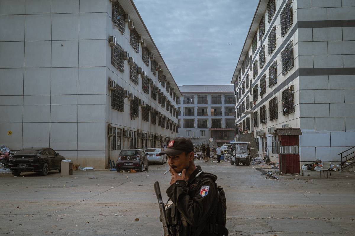Voják Karenské národní osvobozenecké armády hlídkuje v areálu Shunda Park. Přibližně 900 čínských zaměstnanců zde po razii zůstalo několik týdnů zabarikádováno, protože se obávali, že repatriace by mohla vést k okamžitému zatčení čínskými úřady. (5. prosince 2025)
