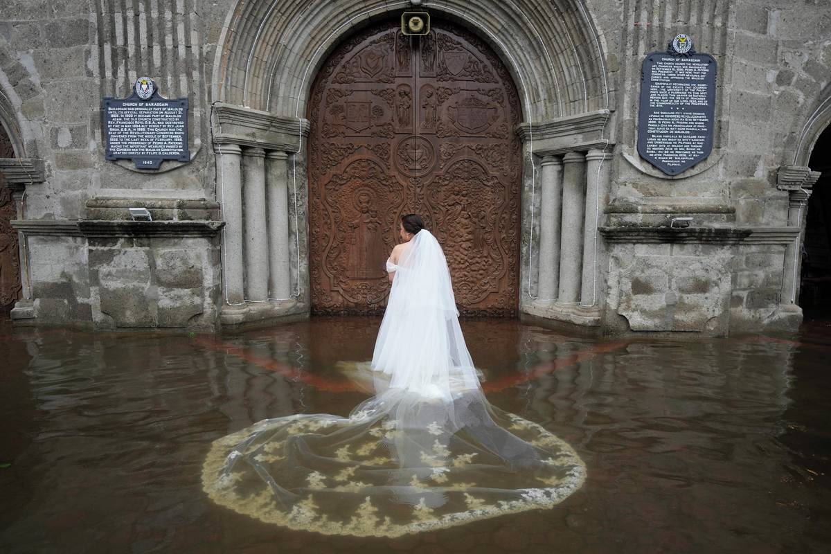 Oceněným v kategorii Příběh se stal Aaron Favila (Associated Press) za snímky svatby během povodně. (Jamaica Aguilarová se připravuje na vstup do zaplaveného kostela Barasoain, kde se bude konat její svatba. Kostel se nachází v oblasti, kde je téměř 75 % obyvatelstva vystaveno riziku povodní. Malolos, provincie Bulacan, Filipíny, 22. července 2025.)