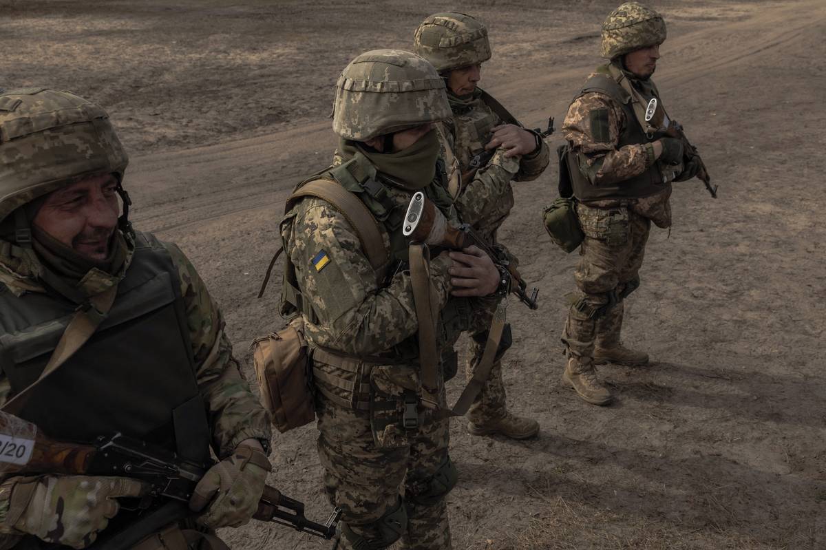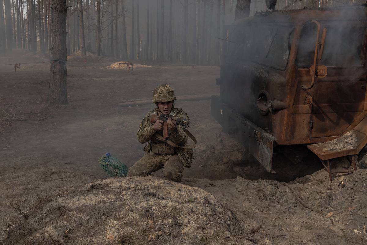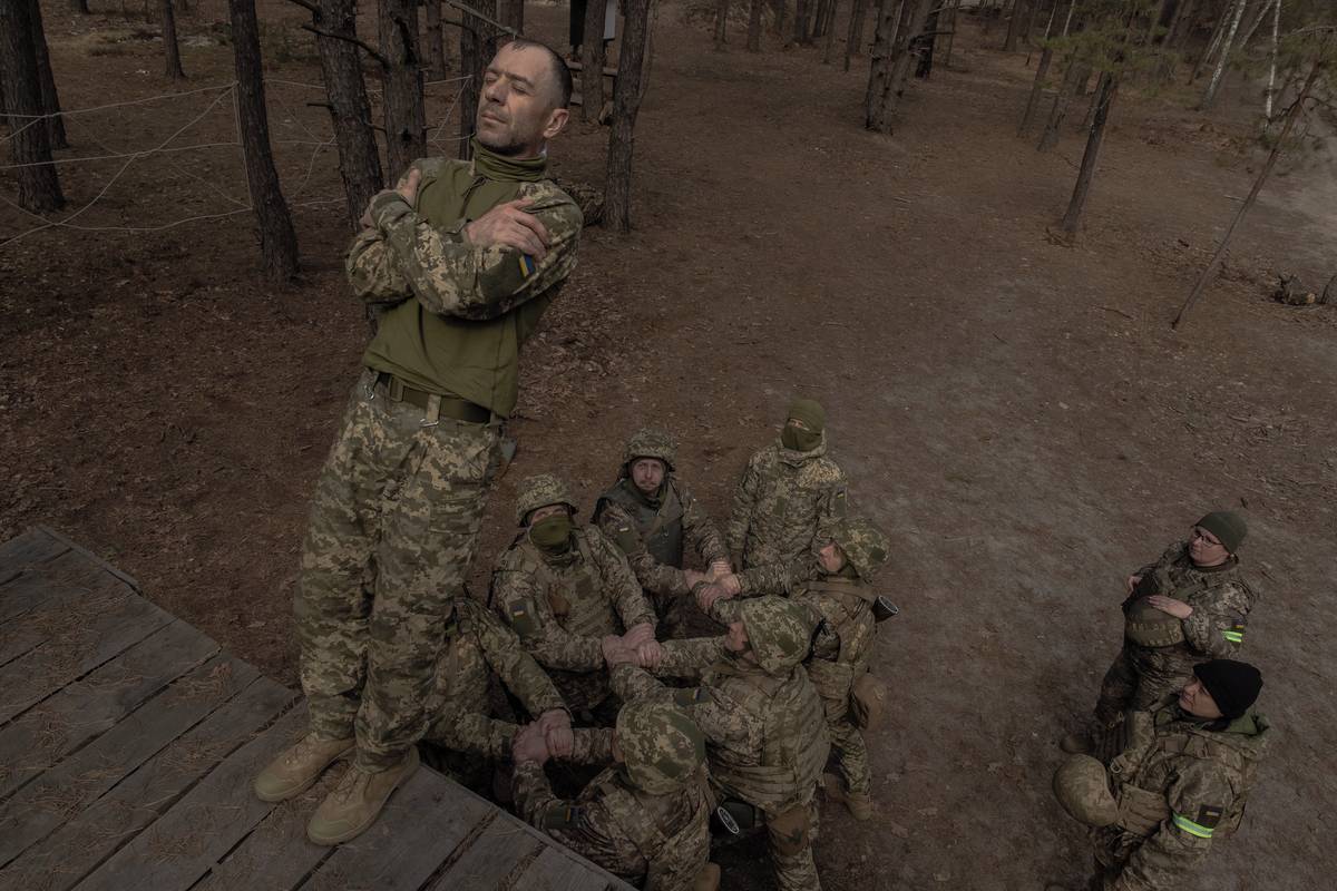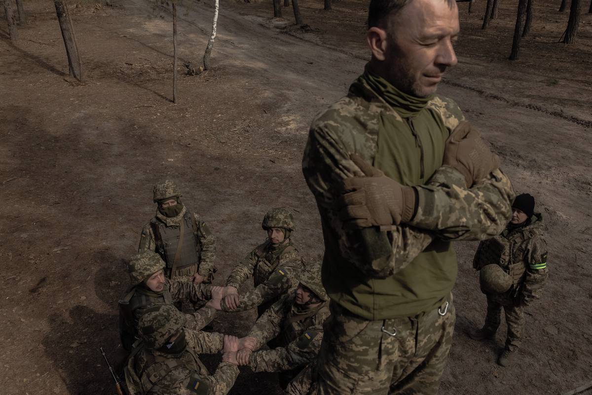 (Ukrajinští rekruti během základního vojenského výcviku, 25. března na utajeném místě na Ukrajině.)