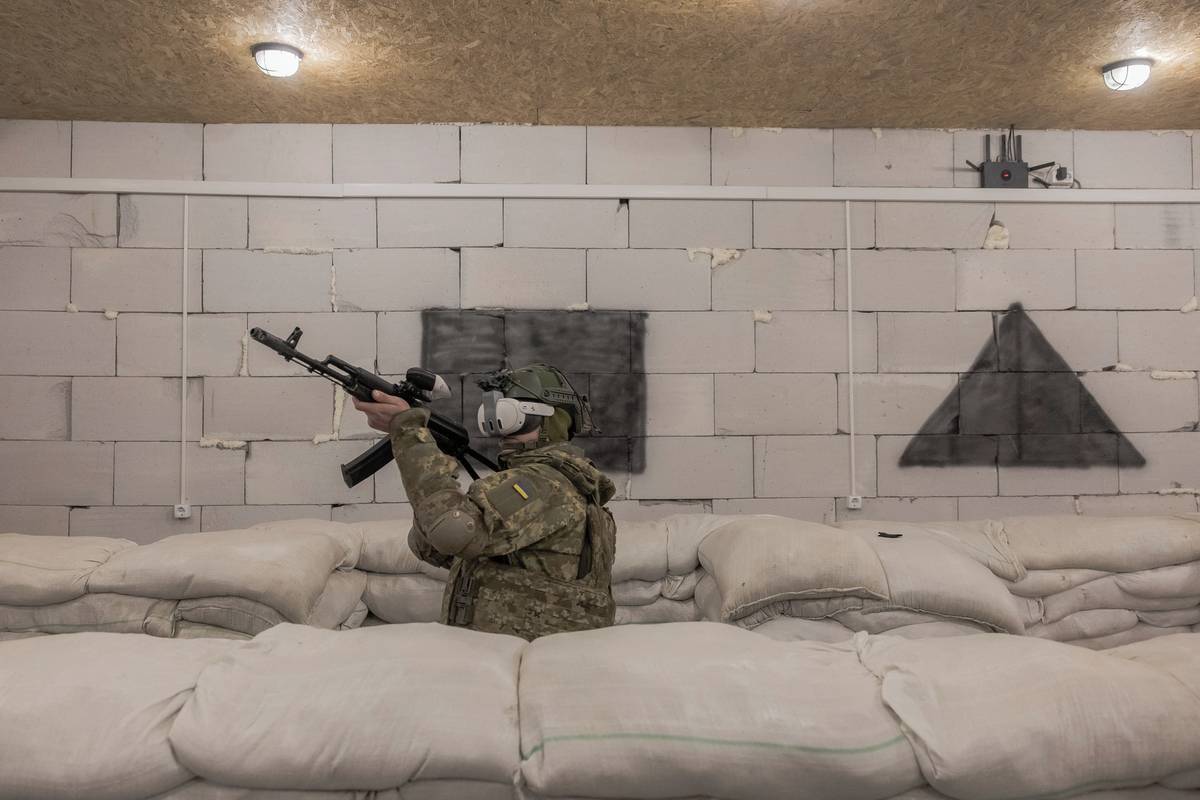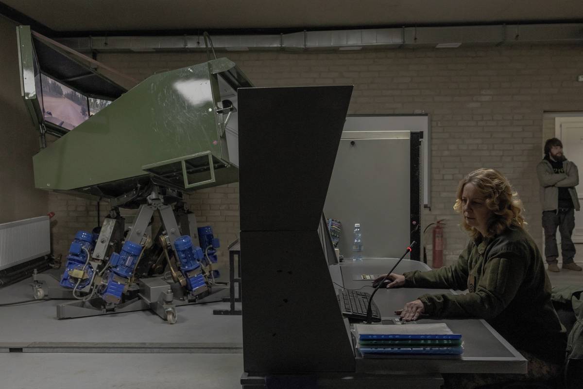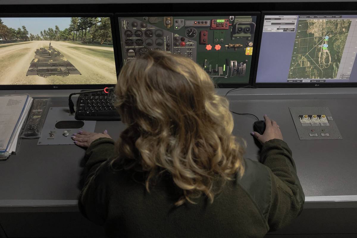 (Cvičení řidičských dovednosti na simulátoru obrněného vozidla ve výcvikovém středisku ukrajinských pozemních sil na utajeném místě, 25. března.)
