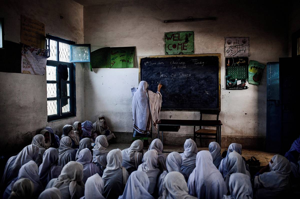 Žákyně během výuky ve škole, na kterou 21. prosince 2012 zaútočilo radikální hnutí Tálibán v rámci kampaně zaměřené na to, aby dívkám znemožnil přístup ke vzdělání. Swabi, Khyber Pakhtunkhwa, Pákistán, 4. června 2013.