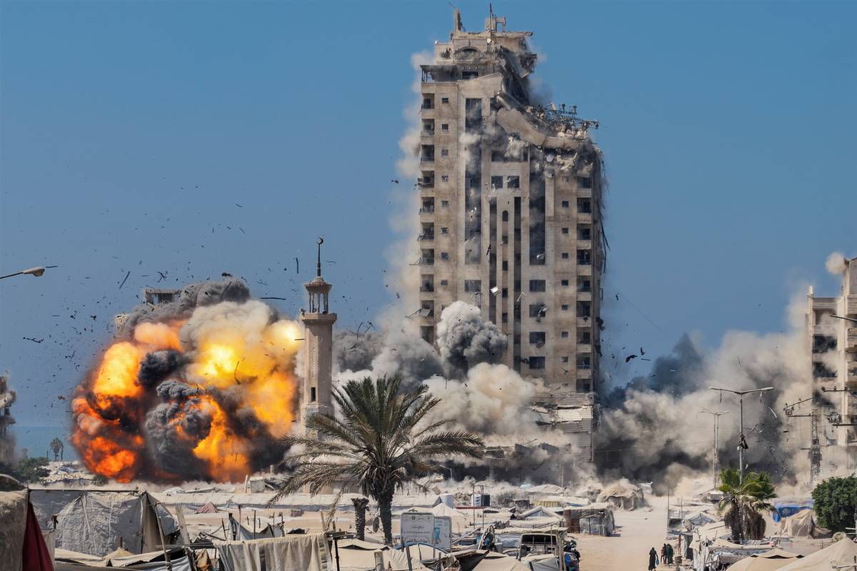 (Věž Mushtaha se zřítila při vojenském útoku. Stála u stovek provizorních stanů, v nichž našli útočiště vysídlení Palestinci. Pásmo Gazy, 5. září 2025.)