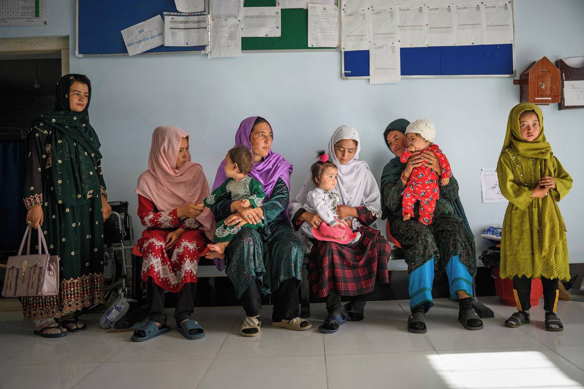 (Ženy čekají na Gulshaman, jedinou porodní asistentku v rodinném zdravotním středisku ve Warasu, která pracuje, aniž by dostávala plat. Provincie Dájkundí, Afghánistán, 20. července 2025.)