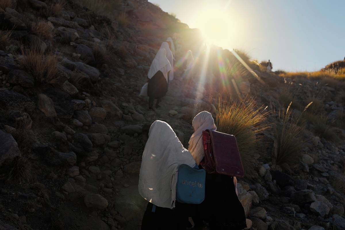 Žáci kráčí do základní školy Miadad ve vesnici Khartanai. Stovky dětí po celém Afghánistánu musí pěšky urazit dlouhé vzdálenosti, aby se dostaly na vyučování. Okres Haska Meyna, Afghánistán, 13. listopadu 2025.