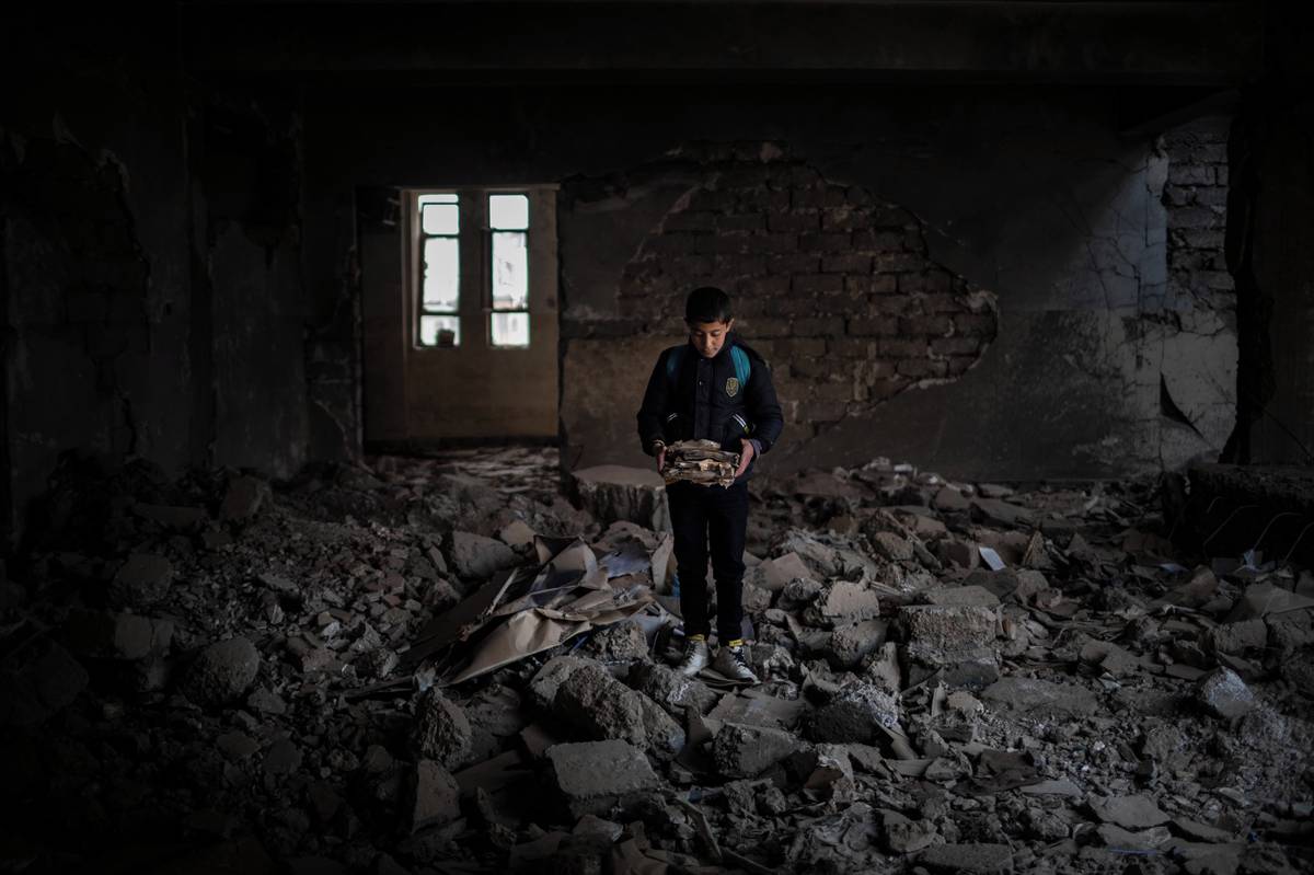 (Yousef, 12, sní o tom, že se stane policistou. Jeho škola byla těžce poškozena během bojů o Mosul v letech 2016 až 2017. Mosul, Irák, 6. března 2022.)