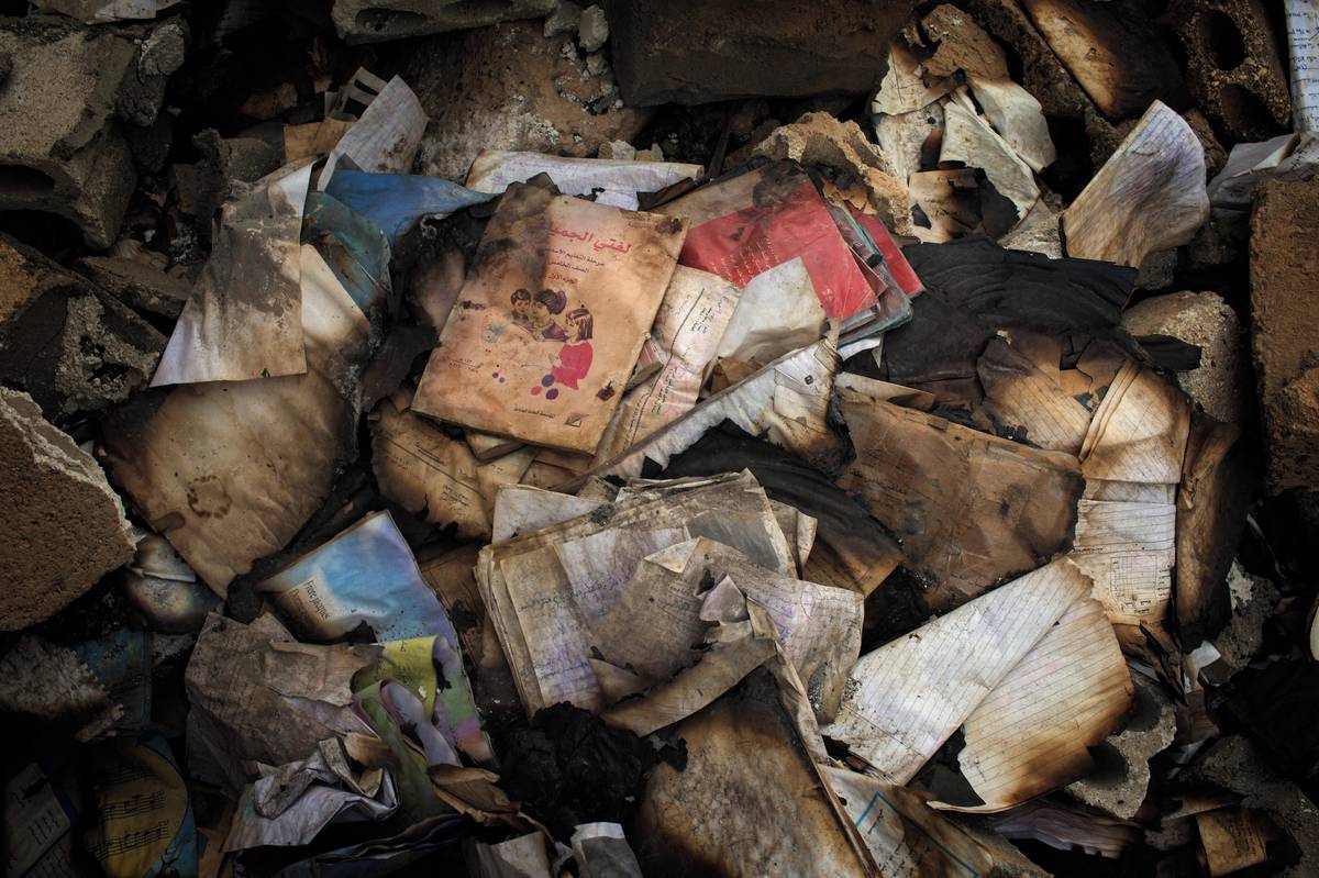 Stovky učebnic spálených extremisty z tzv. Islámského státu ve škole Hani Hakufa. Nejméně čtvrtina syrských škol byla poškozena nebo zničena. Al-Shaddadi, Sýrie, 11. dubna 2016.