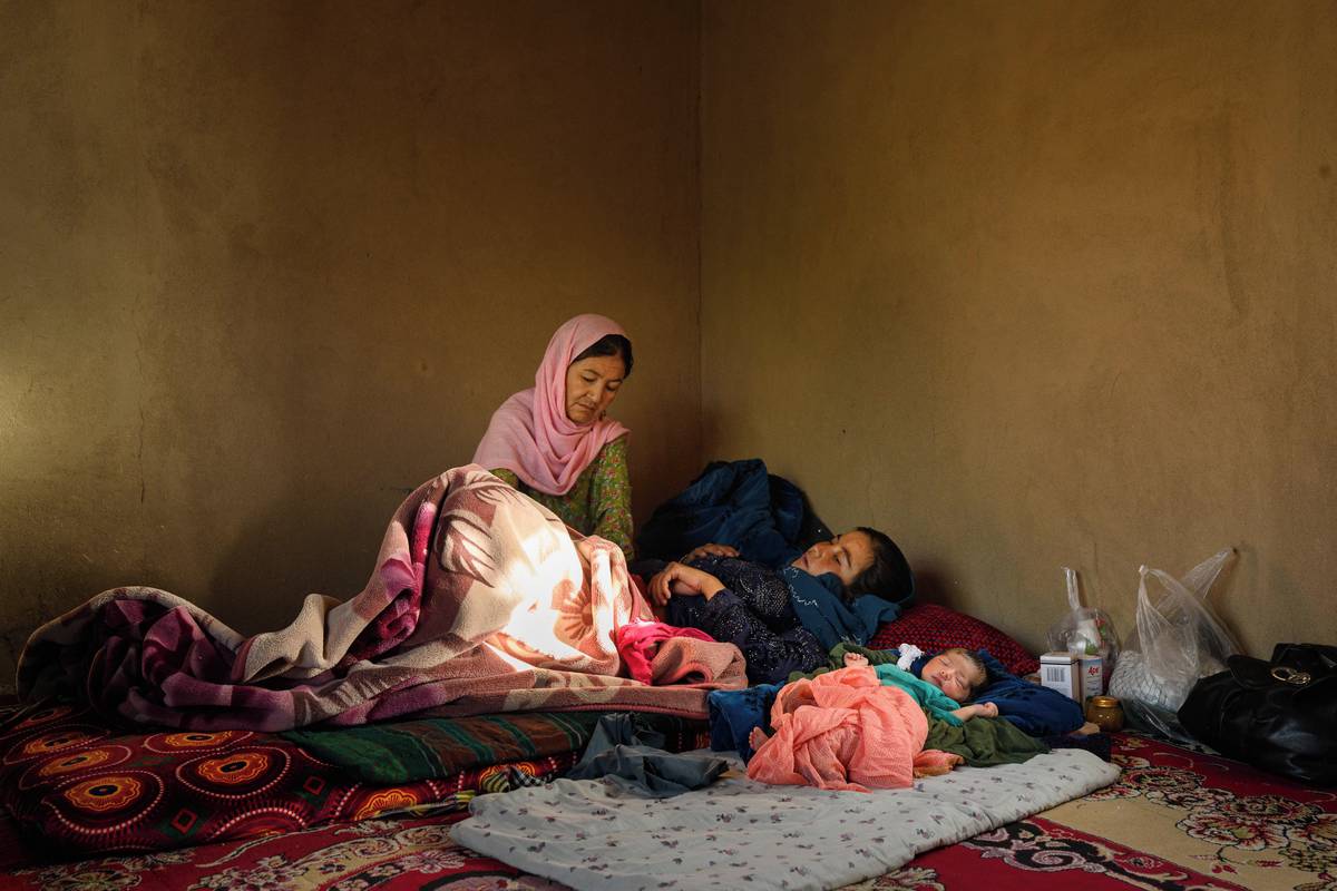 (Porodní asistentka Gulshaman na návštěvě u Fatemah, jejíž dcera Yasmin se narodila předchozí den. Waras, provincie Dájkundí, Afghánistán, 27. července 2025.)