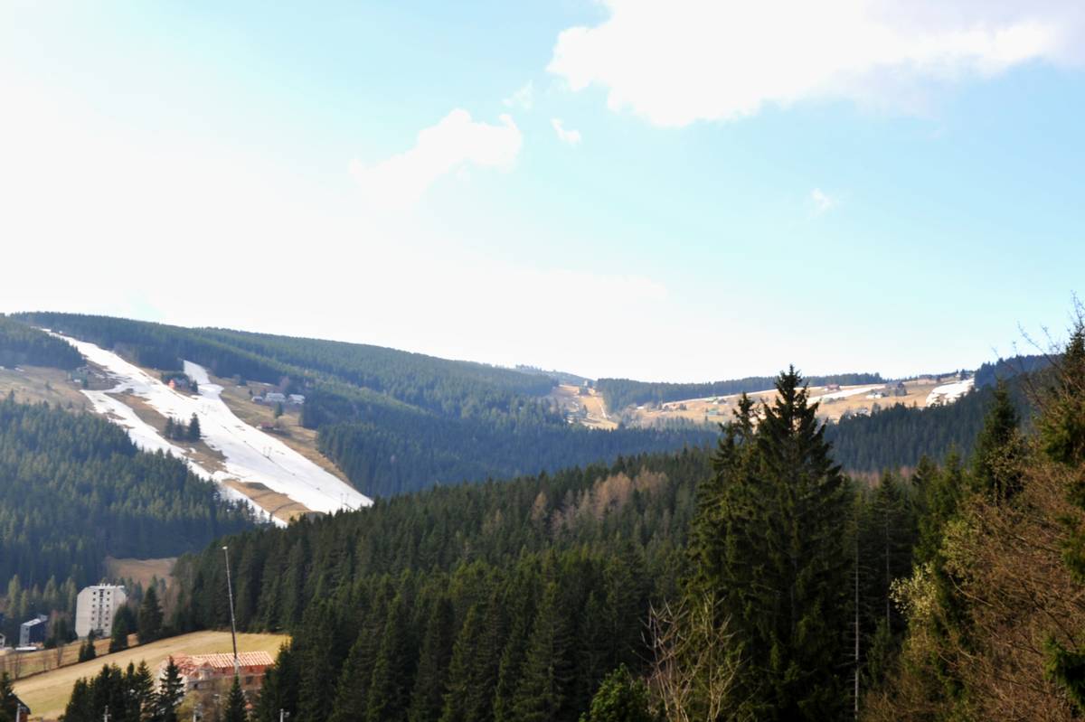 V Peci pod Sněžkou už po sněhu není ani památka, poslední zbytky technického leží na sjezdovkách. Pohled na sjezdovku Javor (vlevo) od hotelu Děvín.