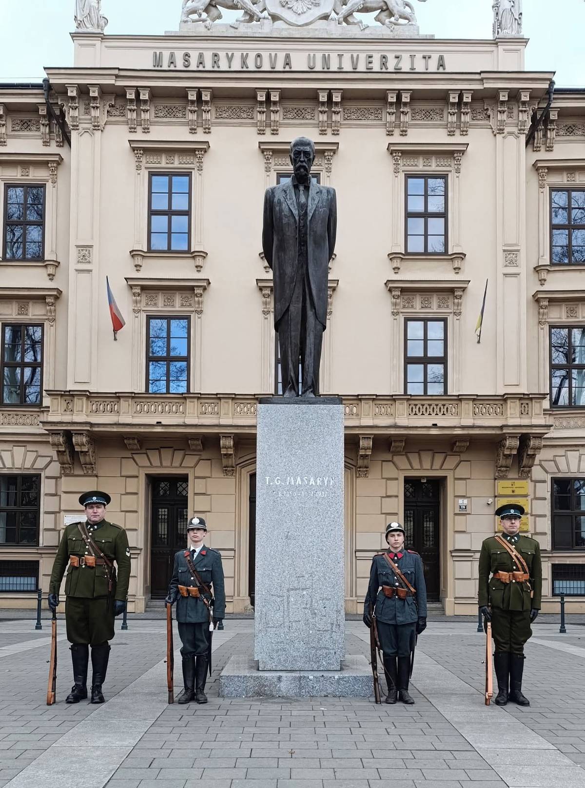 Čestná stráž kuřimských četníků u sochy prezidenta Tomáše G. Masaryka v Brně