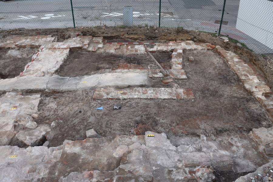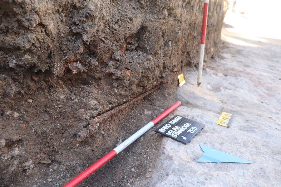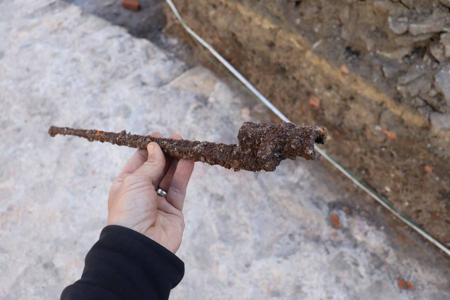 Sovětský bajonet z pušky Mosin-Nagant ve vrstvě nad jižním obvodovým zdivem