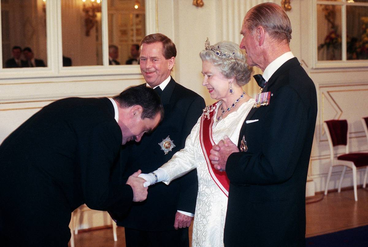 Karel Schwarzenberg se klaní královně Alžbětě II., jež se v doprovodu svého manžela prince Philipa, vévody z Edinburghu, zúčastnila recepce, kterou na Pražském hradě na jejich počest uspořádal v roce 1996 prezident Václav Havel.
