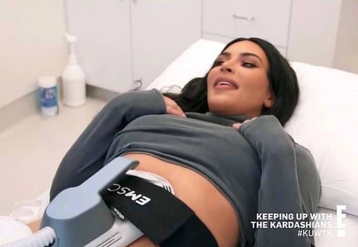 Nejznámější snímek Kim Kardashian se zeštíhlovacím přístrojem Emsculpt