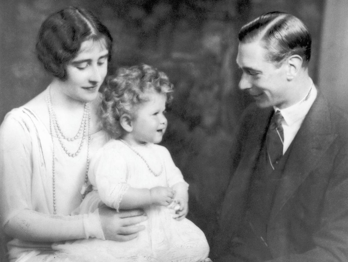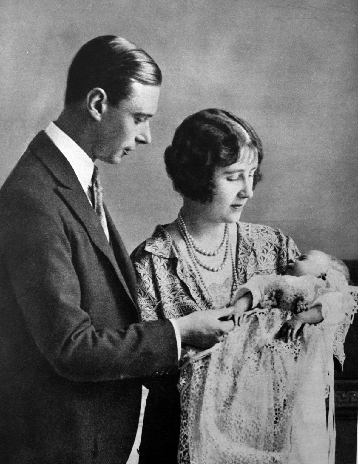 Jedna z prvních fotografií. Vévoda a vévodkyně z Yorku se svou prvorozenou dcerou, budoucí královou Alžbětou II. v roce 1926.