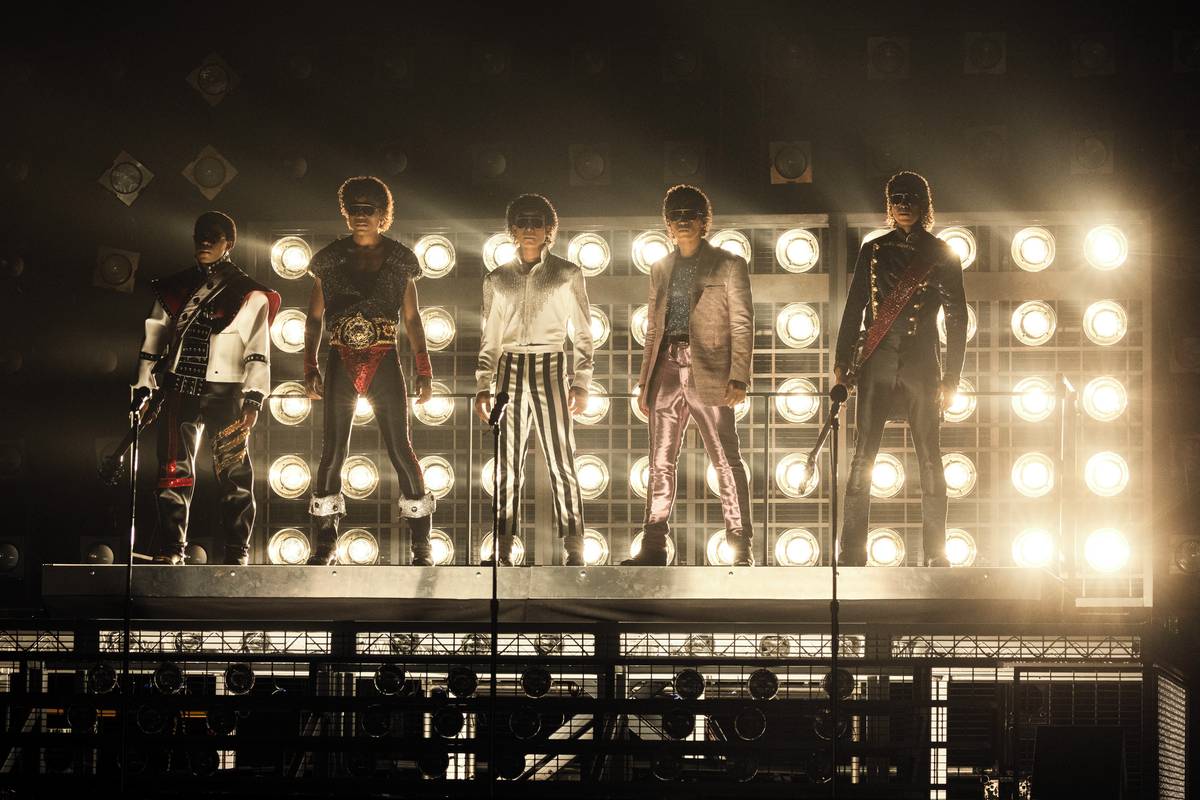 Jackson 5 v dospělosti. Zleva Rhyan Hill, Tre’ Horton, Jaafar Jackson v roli Michaela Jacksona, Joseph David-Jones, Jamal Henderson.