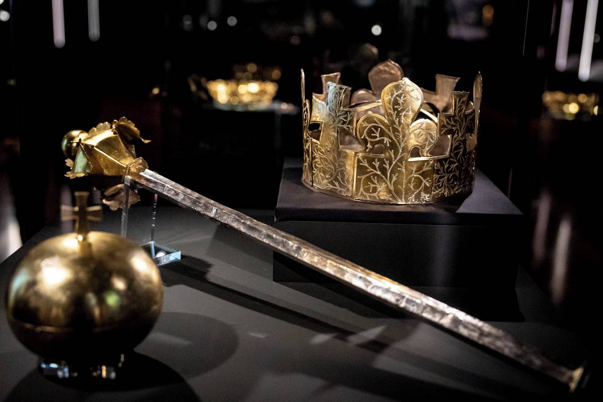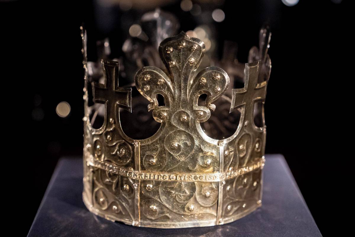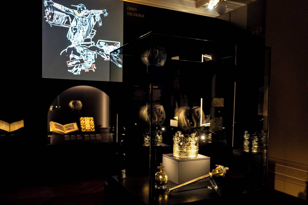 Pohřební klenoty Přemysla II. Otakara, prvního českého panovníka evropského významu. Koruna, žezlo i jablko patří k ozdobám výstavy.