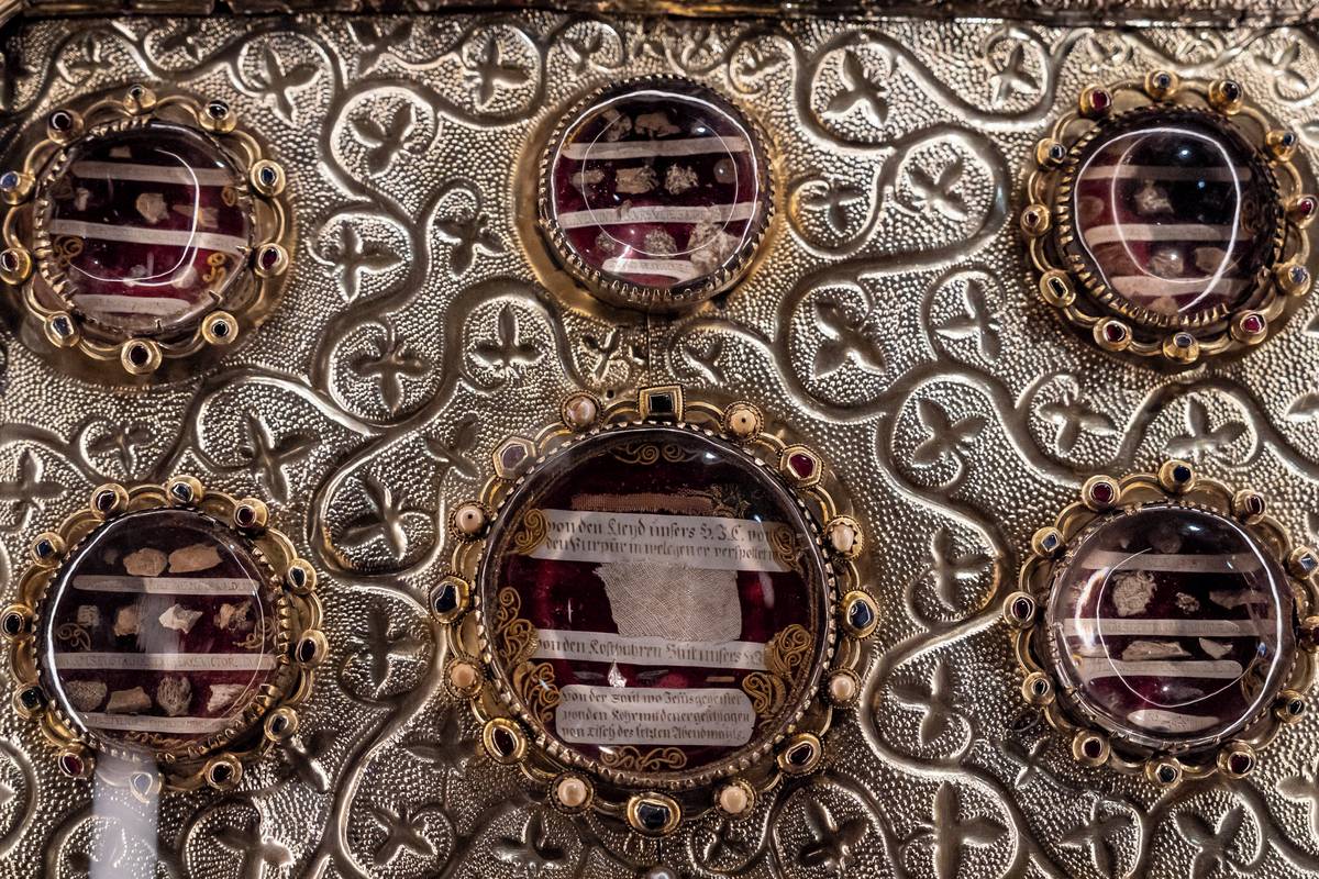 Pod křišťálem jsou skryty relikvie spojené s Kristem, Pannou Marií i dalšími světci.