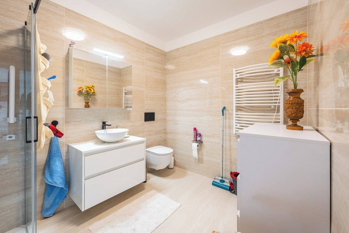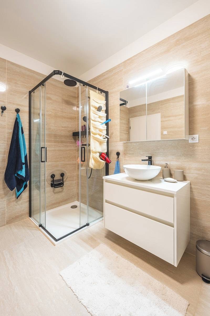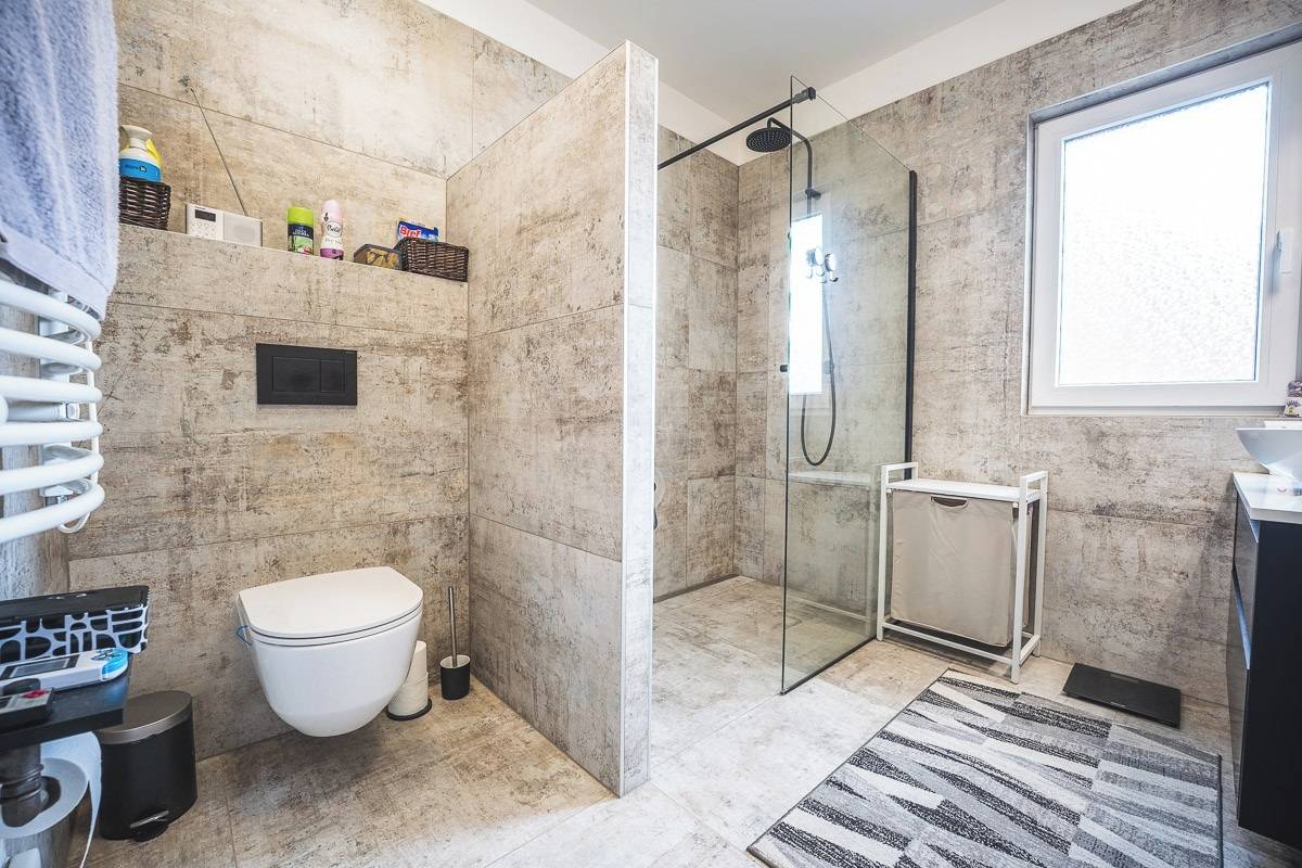 Majitelé chtěli udělat dům co nejvíce bezbariérový. Koupelna je řešená prostorným sprchovým walk-in koutem místo vany.