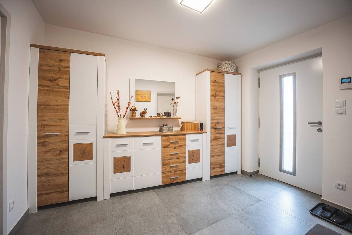 „V základní verzi domu nebyla předsíň a člověk by vstupoval rovnou do obýváku. My jsme si místnosti trochu upravili,“ vysvětluje Jaroslava.