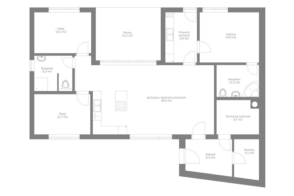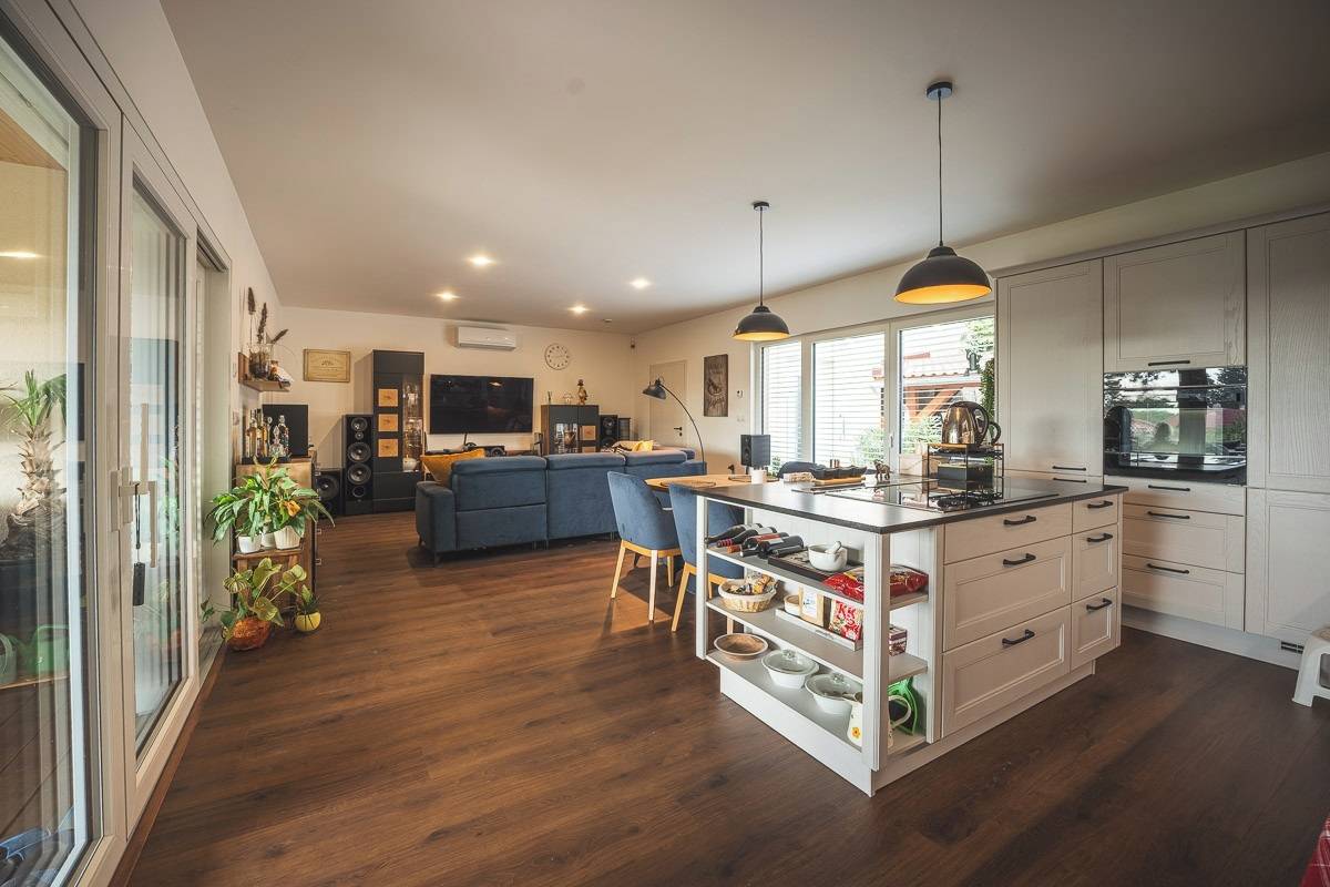 Hlavní obytný prostor propojuje kuchyni, jídelnu i obývací část v jeden velký společný celek.