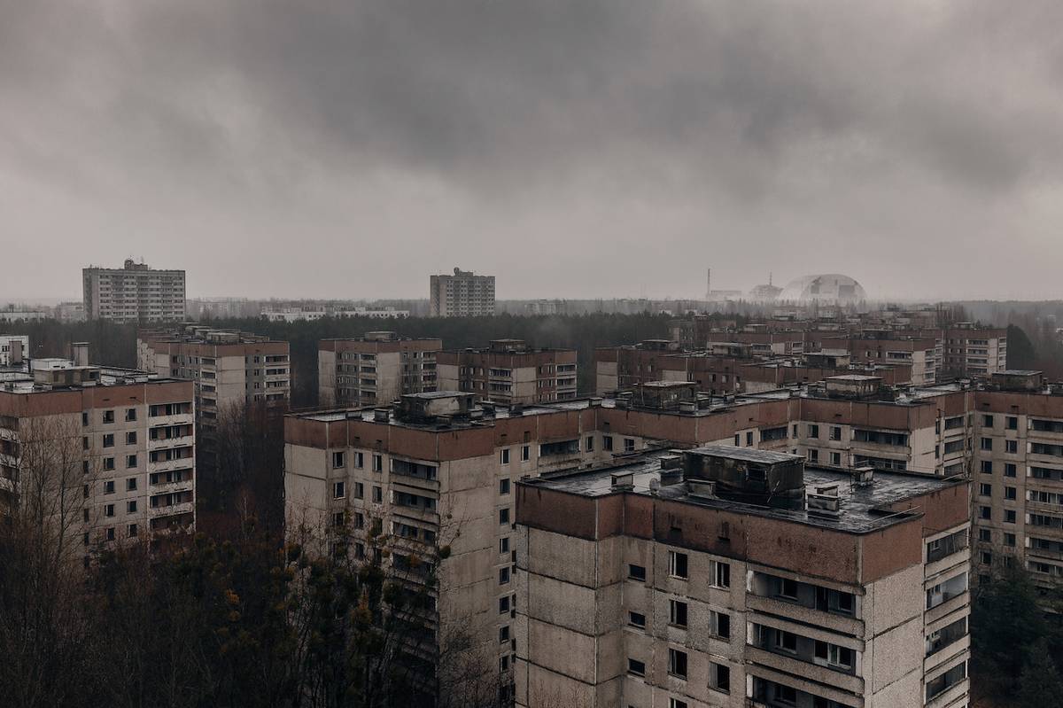 Pripjať v celé své temné kráse. Foceno ze střechy 16patrové budovy apartmánového komplexu Fudžijama. Snímek je z roku 2016, a tak v dáli můžete vidět nový kryt sarkofágu, než jej téhož roku zcela zakryl. Slavnostně odhalen byl až roku 2019.