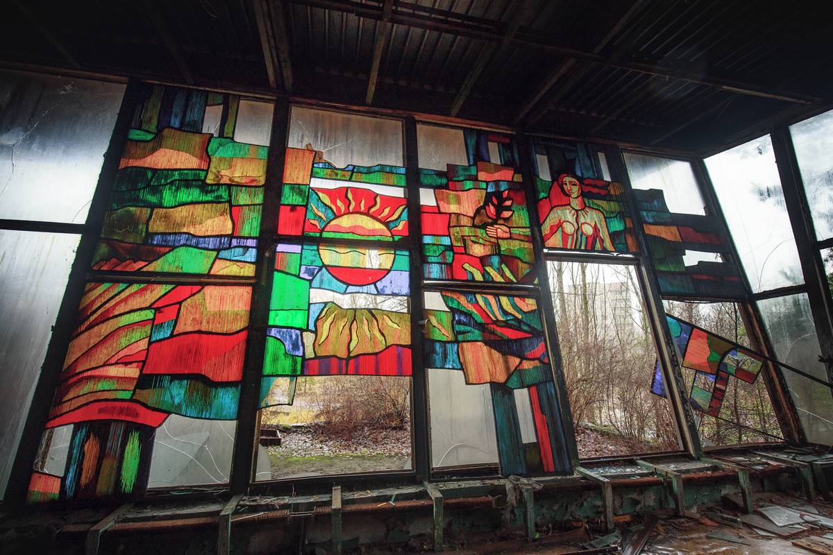 Dochované vitráže v bývalé kavárně Pripjať nedaleko řeky. Tehdy šlo o jedno z nejluxusnějších míst, kde si místní mohli dopřát něco na zub.