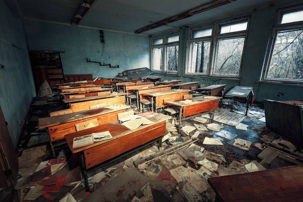 Jedna z opuštěných školních tříd v jedné z mnoha škol ve městě